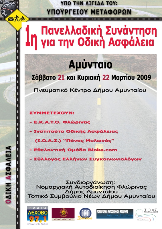 Η Ελληνική Καταναλωτική Οργάνωση (Ε.ΚΑΤ.Ο.) Φλώρινας, ο Δήμος Αμυνταίου και το Τοπικό Συμβούλιο Νέων του Δήμου Αμυνταίου σε συνεργασία με την Εθελοντική Ομάδα bloka.com, με το Ινστιτούτο Οδικής Ασφάλειας (ΙΟΑΣ) «Πάνος Μυλωνάς» και τον Σύλλογο Ελλήνων Συγκοινωνιολόγων (ΣΕΣ), συνδιοργανώνουν την :